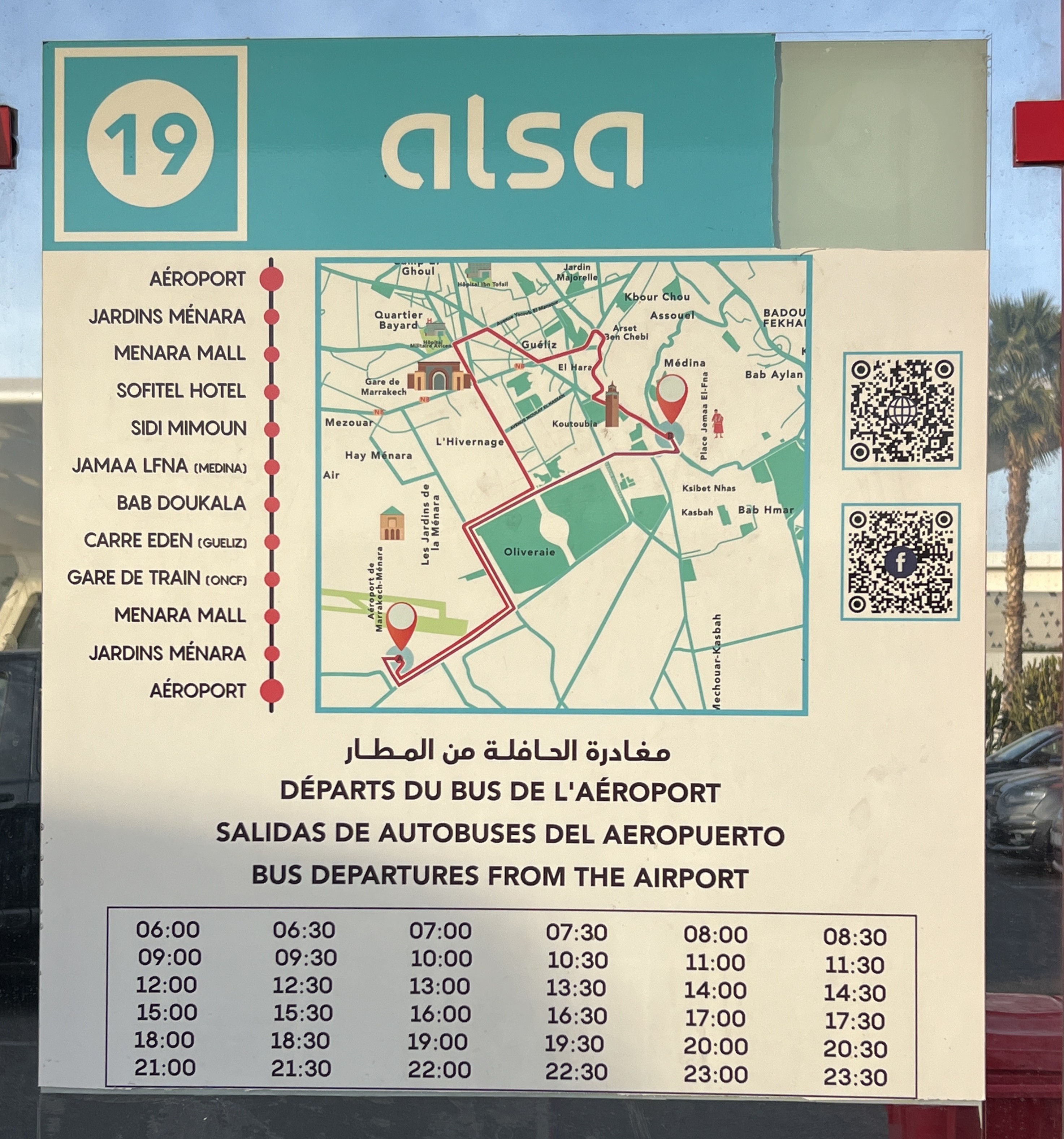 - Route: The shuttle connects the airport with Jemaa el-Fnaa Square, and you can catch it at the open area directly in front of the airport exit. The bus stop is marked with an 'alsa' sign.